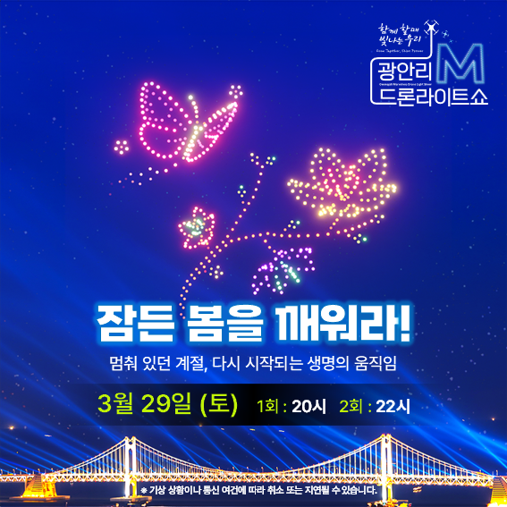 광안리 M 드론라이트쇼는 부산 수영구 광안리 해변에서 매주 토요일 저녁에 열리는 상설 드론 공연입니다.