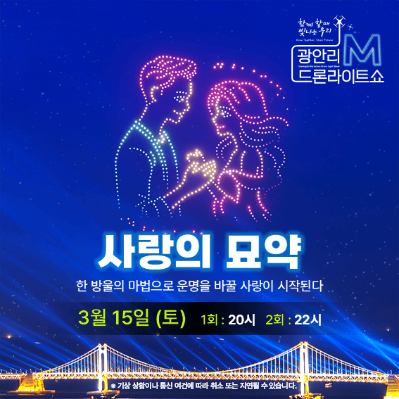 광안리 M 드론라이트쇼는 광안대교의 아름다운 야경과 함께 드론이 만들어내는 환상적인 빛의 향연을 즐길 수 있는 특별한 공연입니다. 주말 저녁, 가족, 친구, 연인과 함께 방문하여 잊지 못할 추억을 만들어보세요.