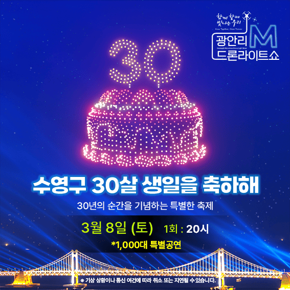 - 3월 8일(토): 수영구 30살 생일을 축하해 *1,000대 특별공연 (20시, 1회)
